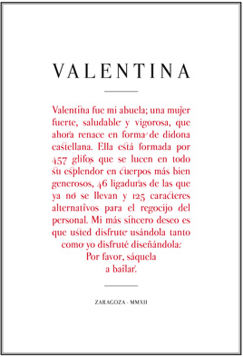 Es una tipografía completa que consta de 457 glifos, entre los que destacan los 125 caracteres latinos alternativos en caja baja o las 46 ligaduras. En tan sólo un año, Valentina ha alcanzado las 120.000 descargas en todo el mundo y ha recibido varios premios que la acreditan como uno de los lanzamientos más sonados del año 2012. Ha aparecido en más de 200 medios especializados de todo el mundo. Proyectos made in España, EE.UU., Australia, Gran Bretaña, Japón utilizan este nuevo tipo de letra en revistas, cuentos y etiquetas, los últimos, la etiqueta de vino de la IV Campaña Vino Solidario de Zaragoza y un vídeo navideño de la Banca Privada d'Andorra. La fuente se puede descargar de su Web (pedroarilla.com/es/valentina)